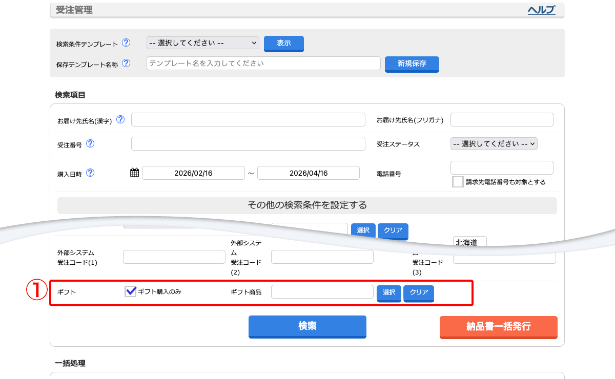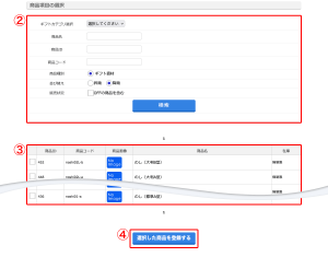 [商品コード]部分一致検索 - 検索結果を一覧表示します。検索条件に追加するギフト資材にチェックを入れます。