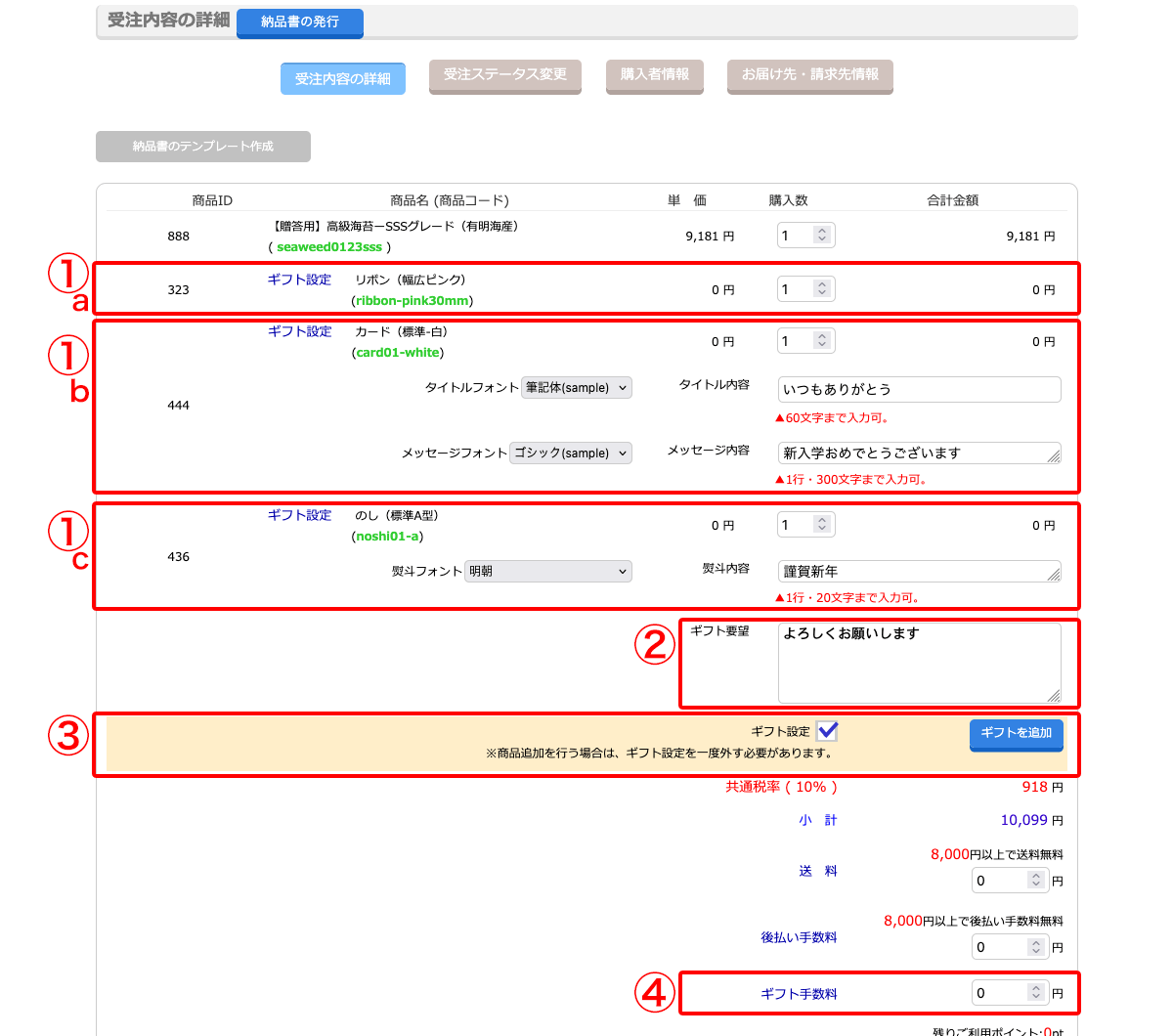 - 購入時にギフト資材を選択済みであればチェックが入った状態です。チェックを外して保存するとギフト資材が削除されます。