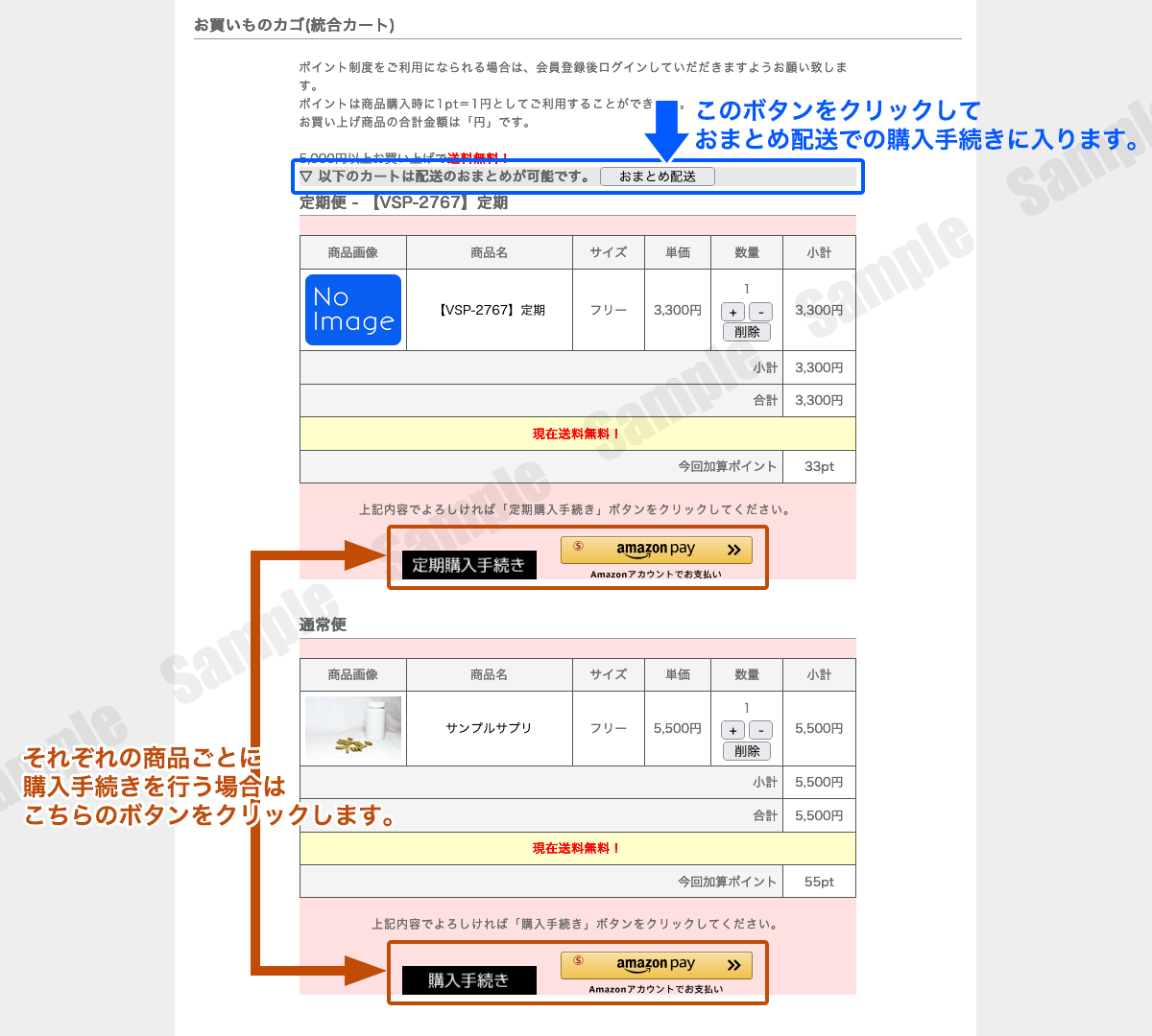 通常商品と定期商品、または複数の定期商品を購入される際、お買いものカゴ画面に[配送おまとめ]ボタンを表示し、これをクリックすることで以降のページにて配送方法や決済方法が一本化され、まとめて購入処理を行うことが可能です。