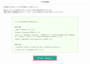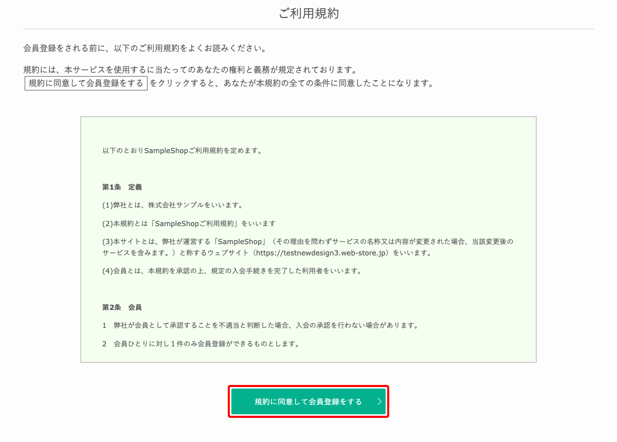 デフォルトデザインでオンラインショップ右上、ログインフォーム下部から利用規約確認ページにアクセスし、規約を確認したうえで[同意する]をクリックします。