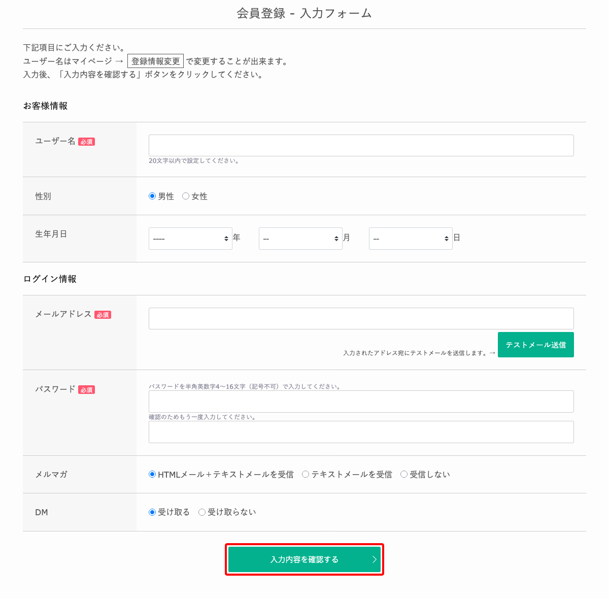 オンラインショップの会員登録専用フォームから会員登録のみを行う、一般的な登録手順です。