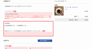 「カート(買い物カゴ)を経由する方法」のとき入力フォーム内に会員登録欄があります。