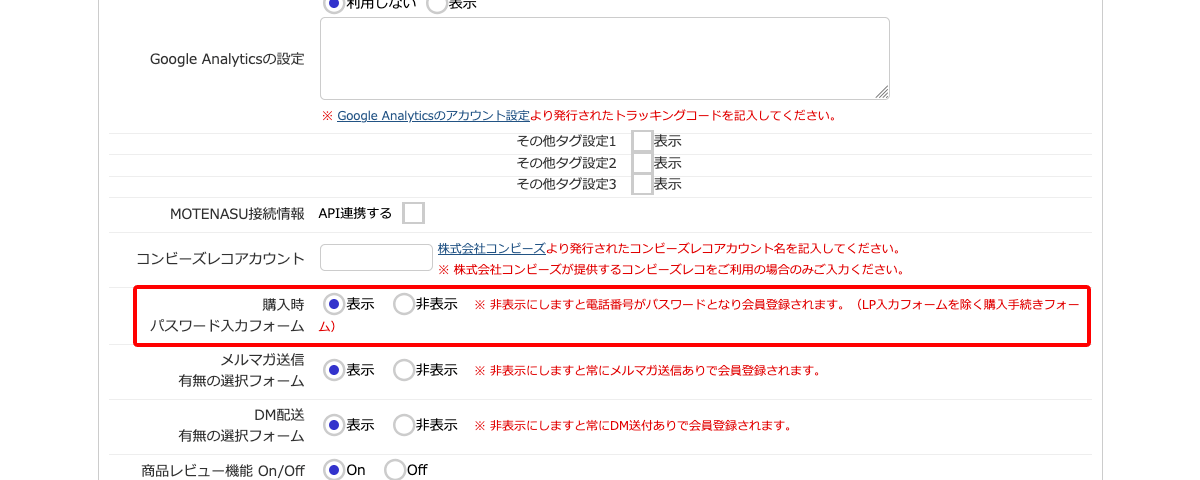 「購入時パスワード入力フォーム」で非表示にチェックを入れます。
