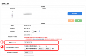 - 次回のお届け希望日を設定します。この日から遡って受注日が設定されますので、現在(作業時点)より過去にならないようご注意ください。