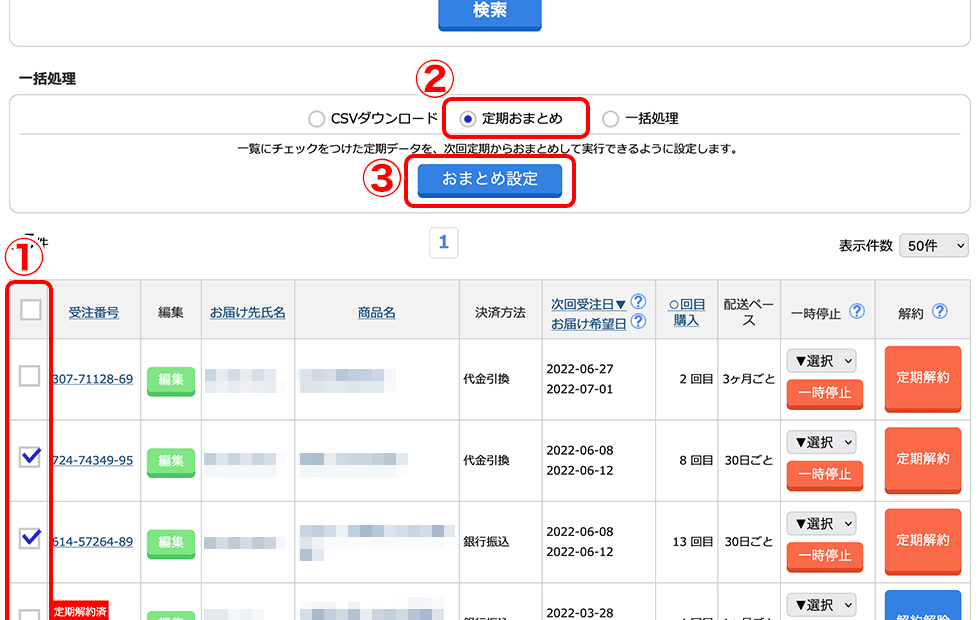 定期おまとめ機能は 管理画面 > 受注管理 > 定期購入者管理 にて、