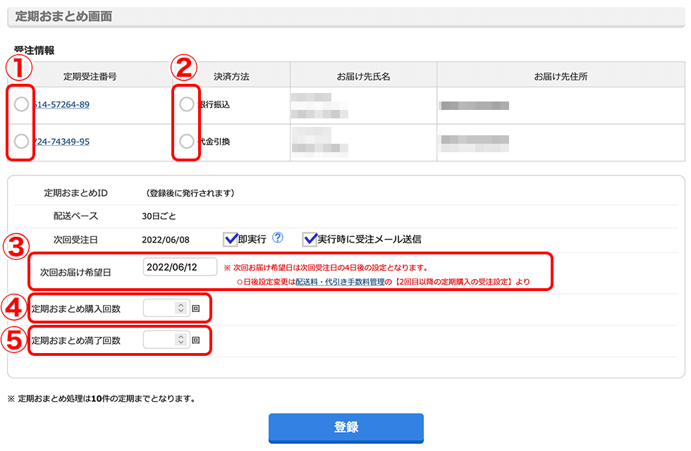 - 定期おまとめとして次回発生する受注の回数を任意に設定することができます。