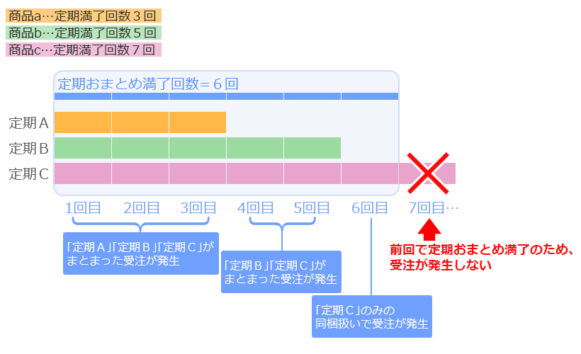 逆に、「定期おまとめ満了回数」に達した場合、商品側の「定期満了回数」に満たない場合でも、次回定期受注は発生いたしません。