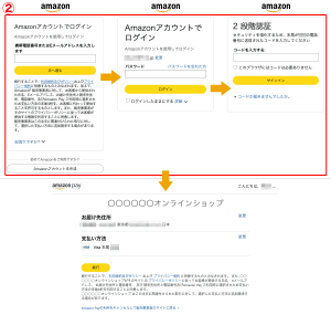 ログイン画面(URLはamazon.co.jp)に移動しますので、お持ちのamazonアカウントでログインします(②)。amazonアカウントの設定などによって2段階認証画面を経由することがあります。